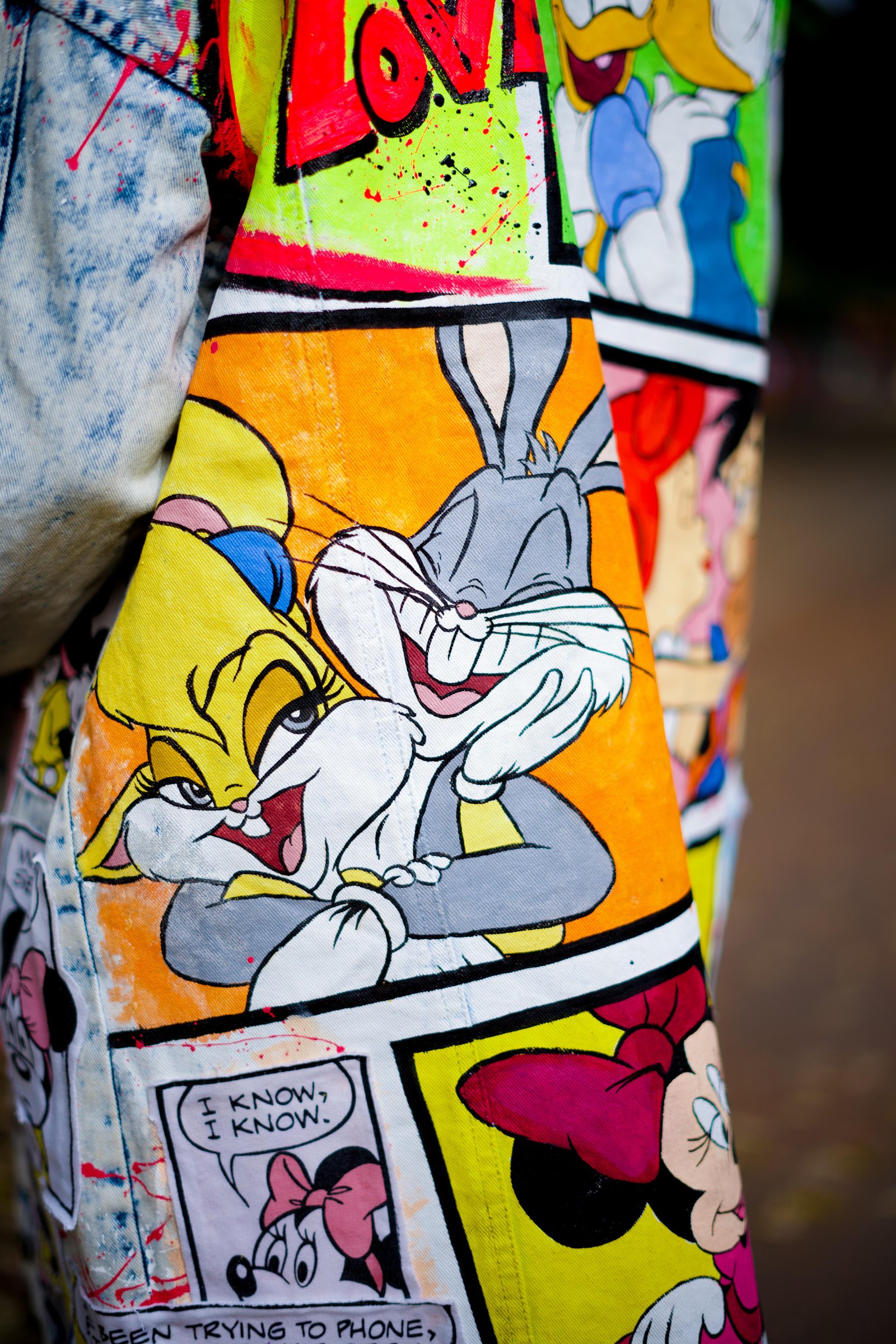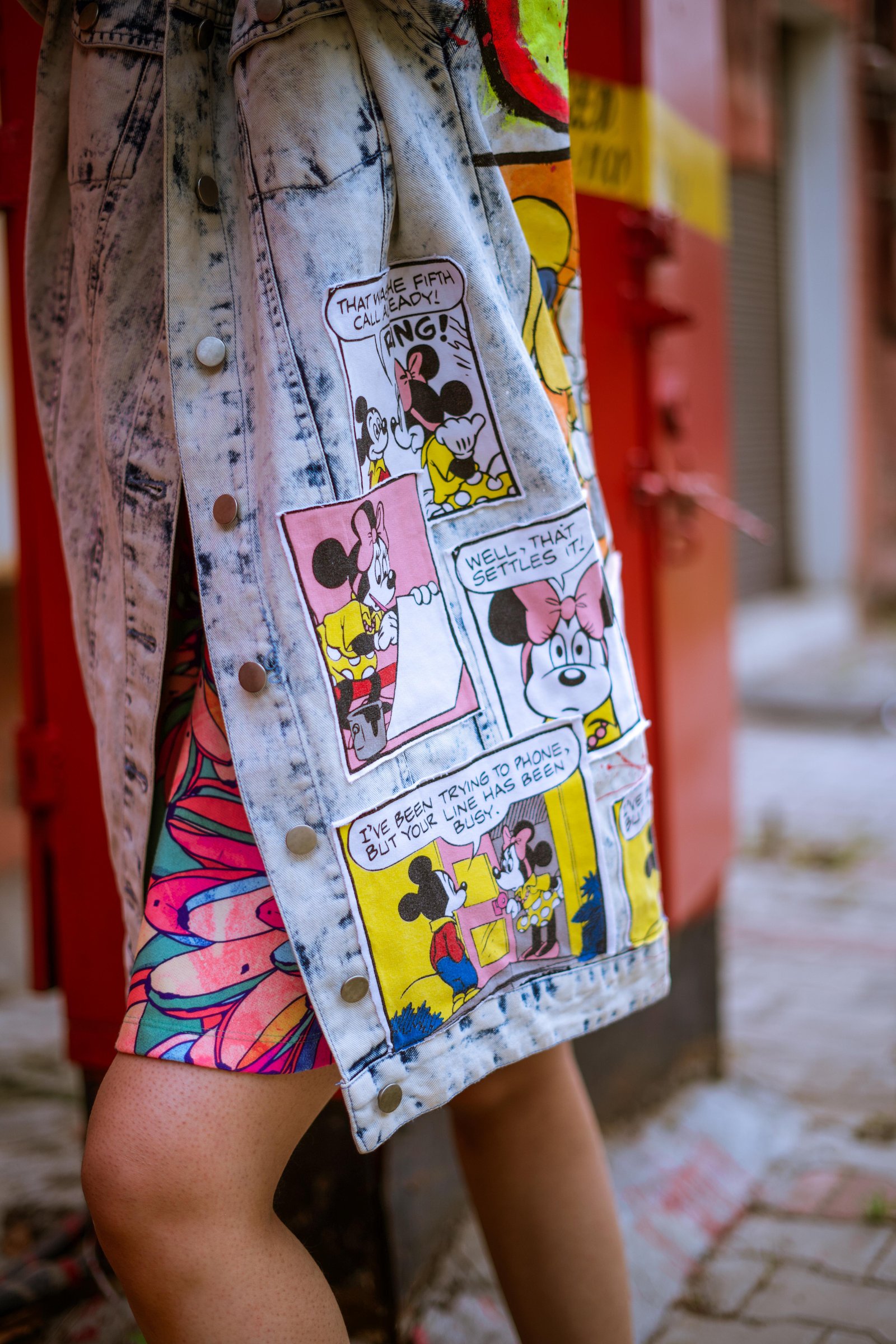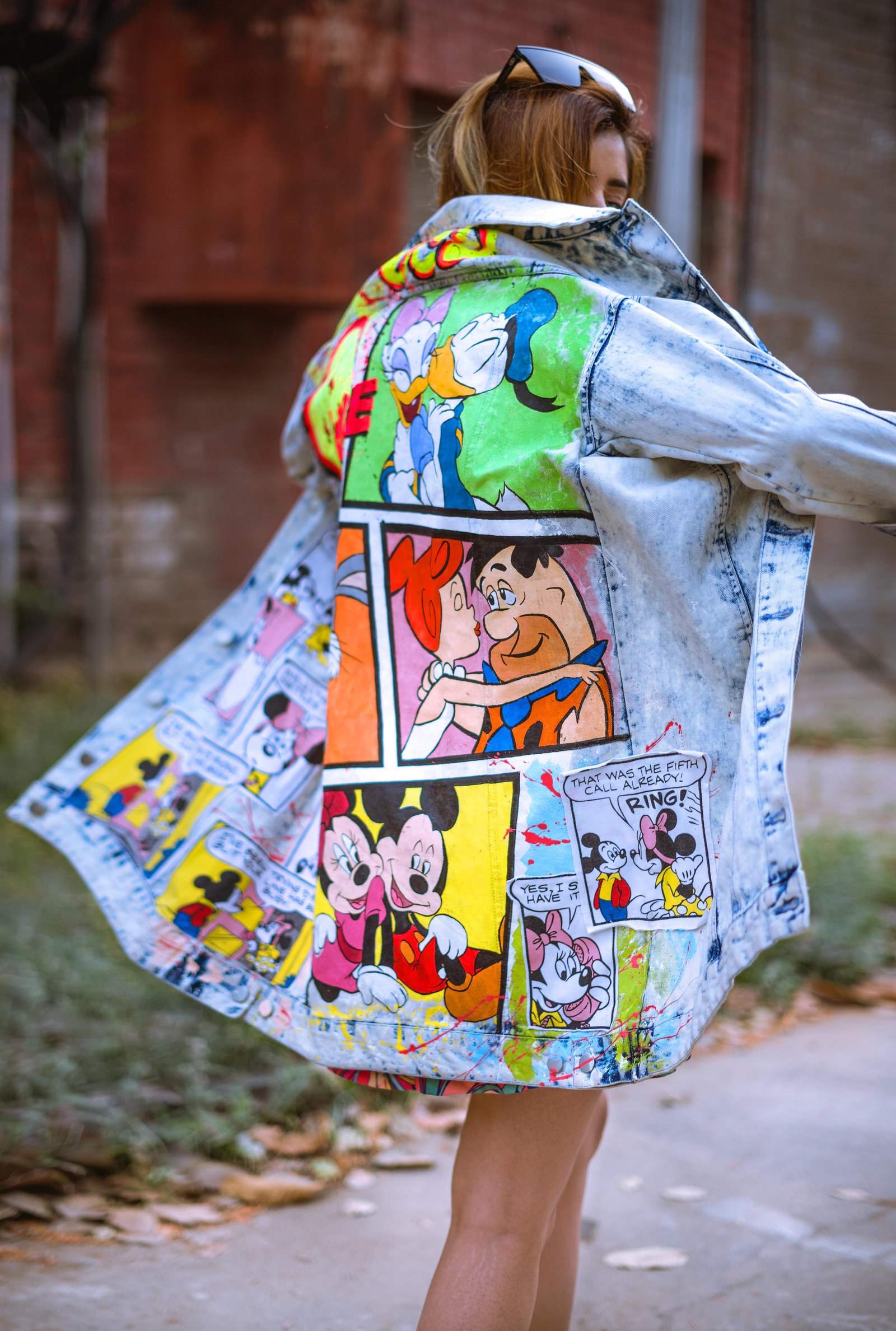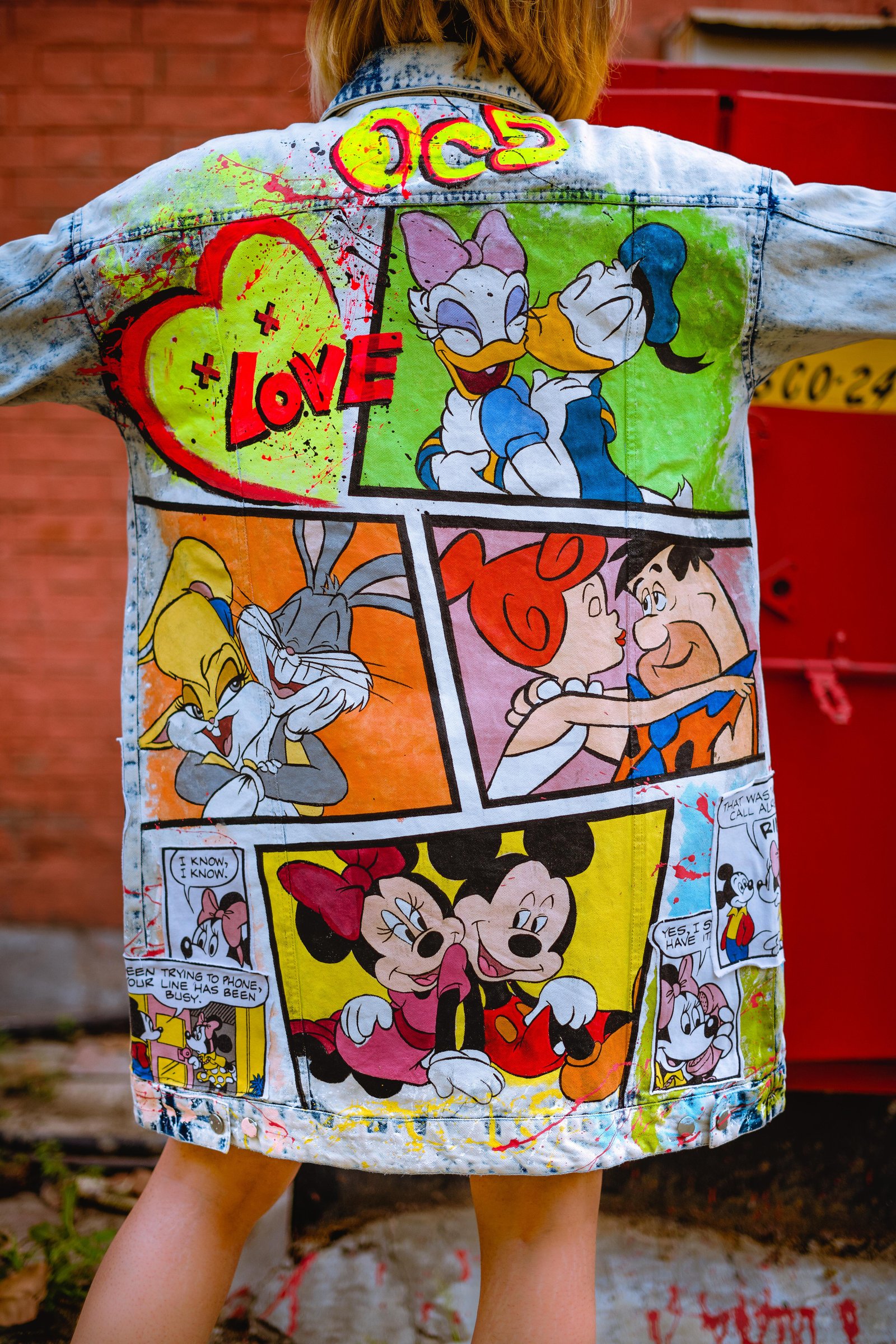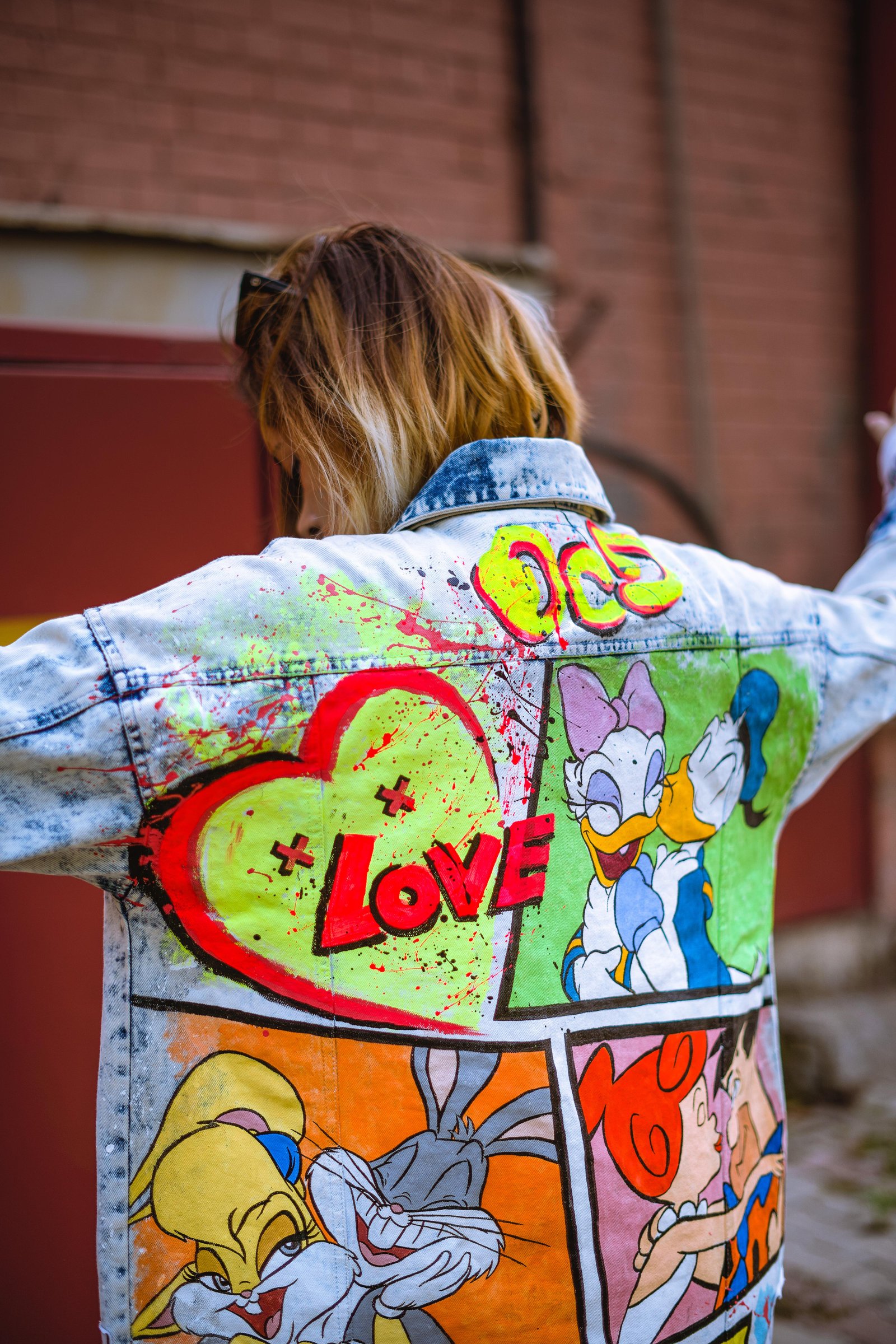 A statement denim jacket celebrating iconic 90s cartoon couples with bold hand-painted comic panels and neon splashes. Blending nostalgia with street style, it playfully explores the fine line between love and lust, making it a true conversation starter. A statement piece that blends vintage vibes with modern streetwear.