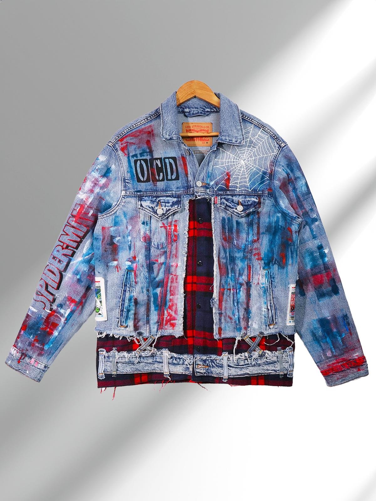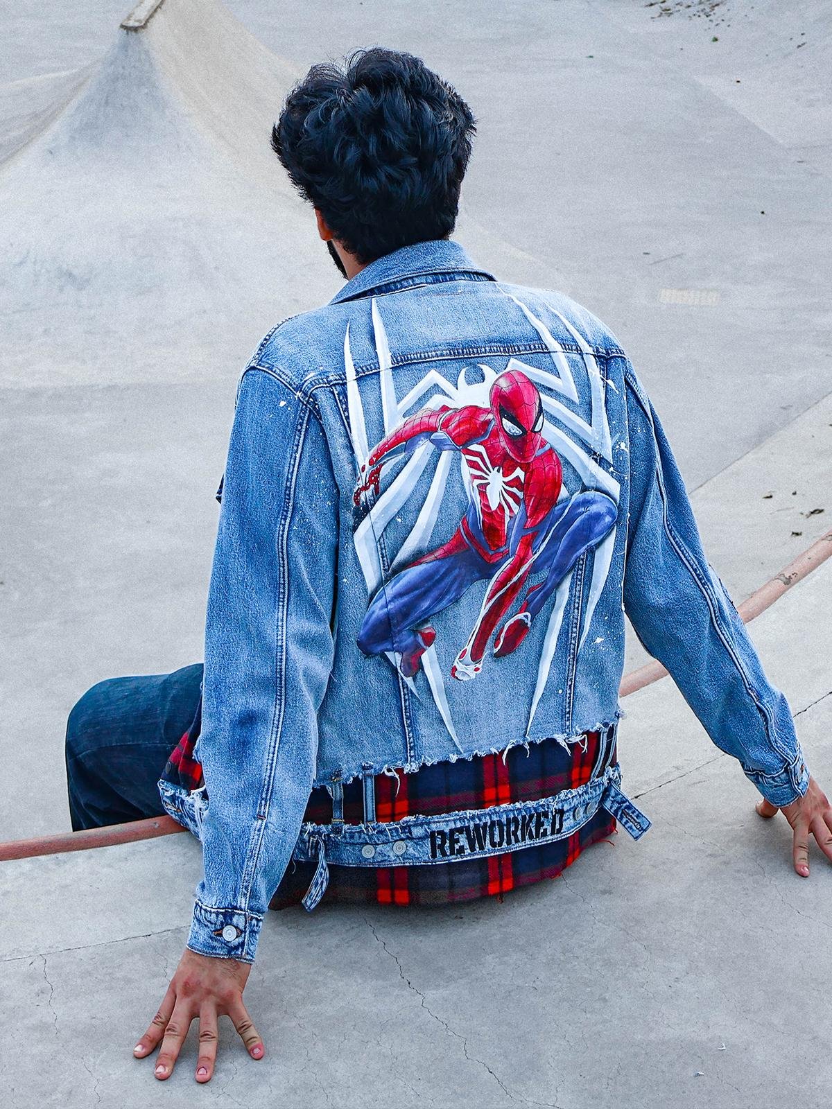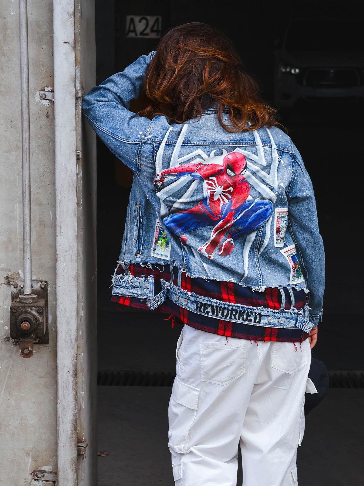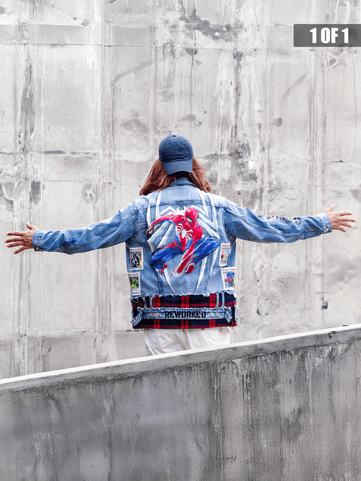 With great power, comes great style.” This Spider-Man denim jacket is a fusion of superhero energy and streetwear edge. The hand-painted Spidey dominates the back, mid-air against a webbed, splatter-painted backdrop. The front boasts distressed denim, plaid paneling, comic-style patches, and intricate web stitching, blending vintage and modern aesthetics. Finished with “Reworked” sleeve detailing, this piece is a true statement for those who swing between nostalgia and bold fashion.