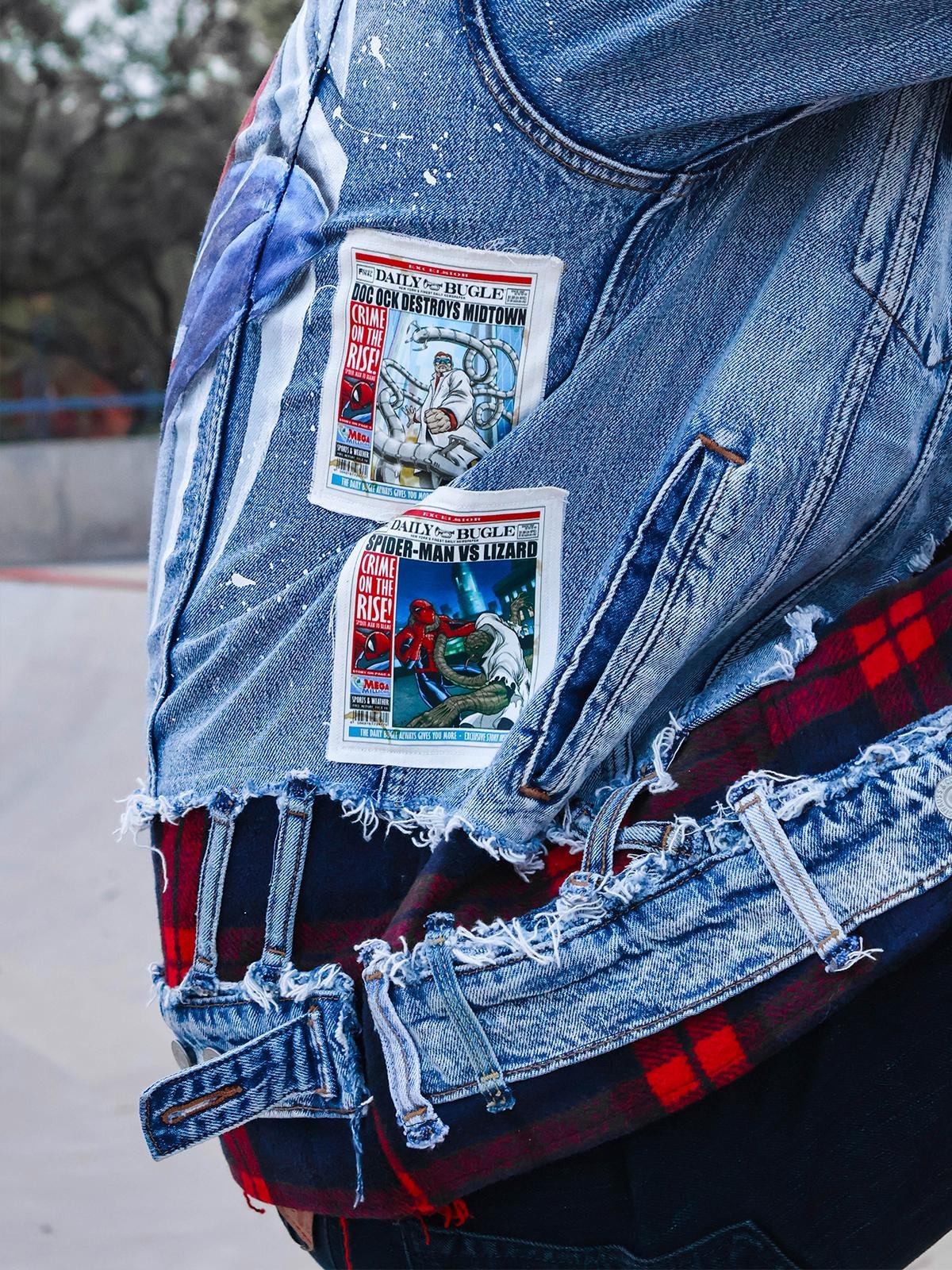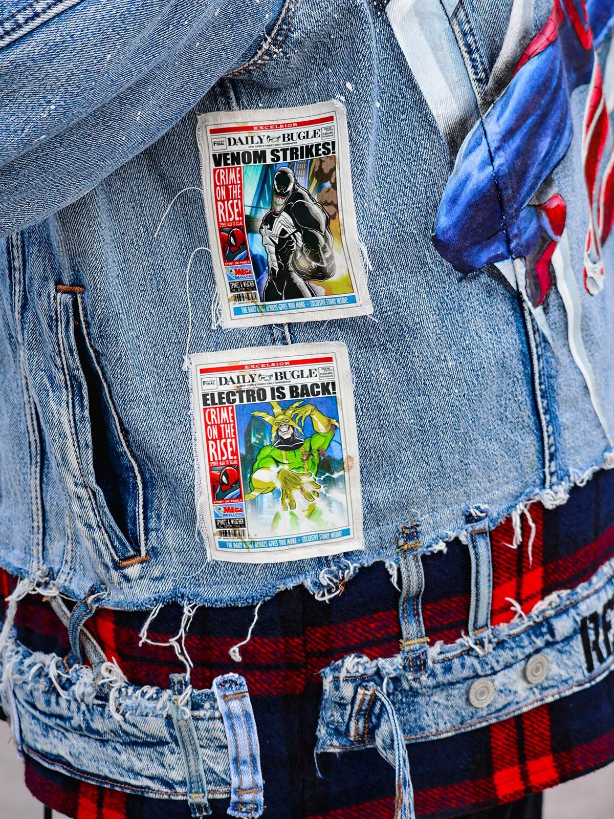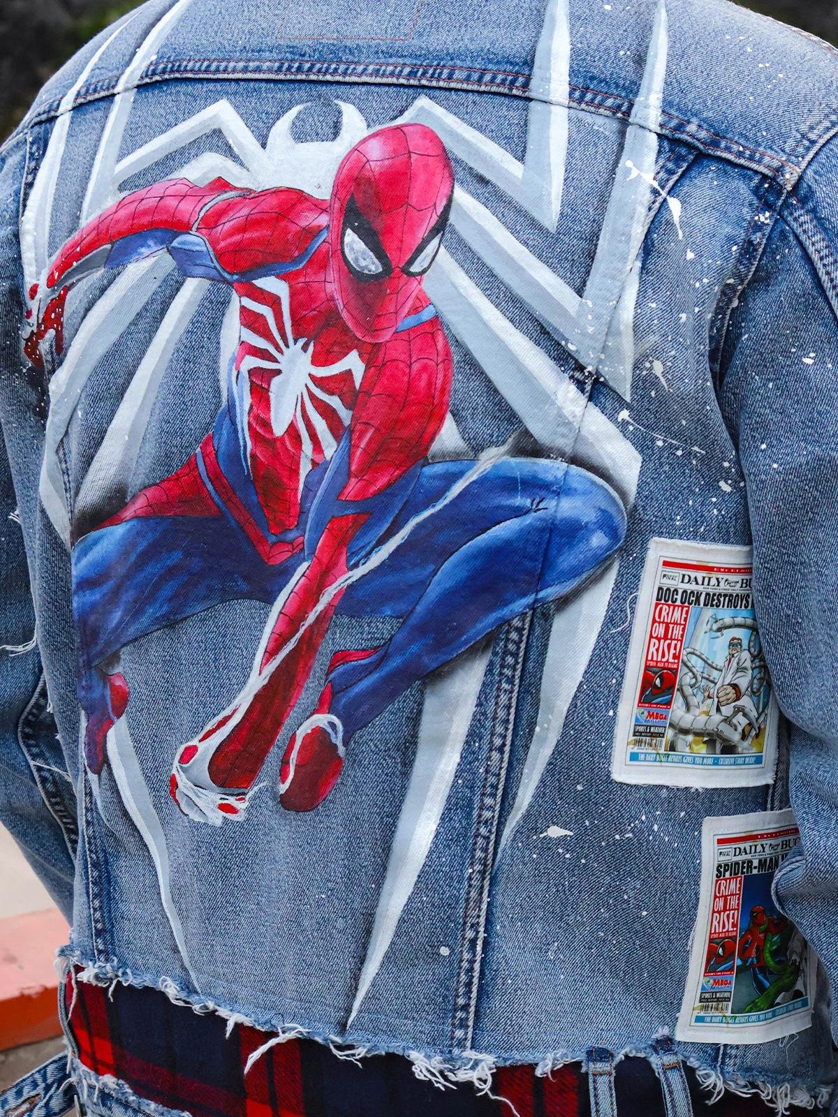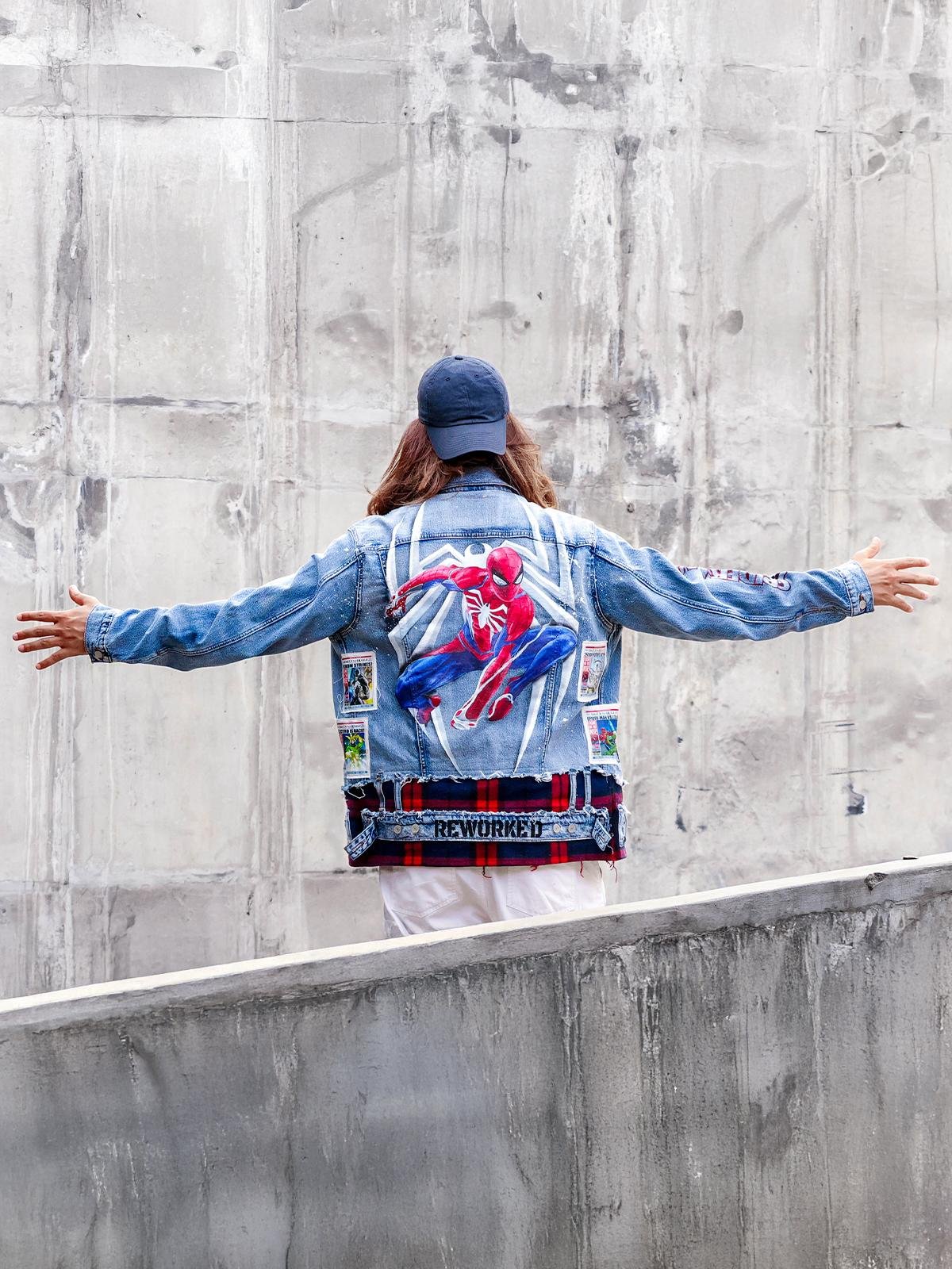 With great power, comes great style.” This Spider-Man denim jacket is a fusion of superhero energy and streetwear edge. The hand-painted Spidey dominates the back, mid-air against a webbed, splatter-painted backdrop. The front boasts distressed denim, plaid paneling, comic-style patches, and intricate web stitching, blending vintage and modern aesthetics. Finished with “Reworked” sleeve detailing, this piece is a true statement for those who swing between nostalgia and bold fashion.