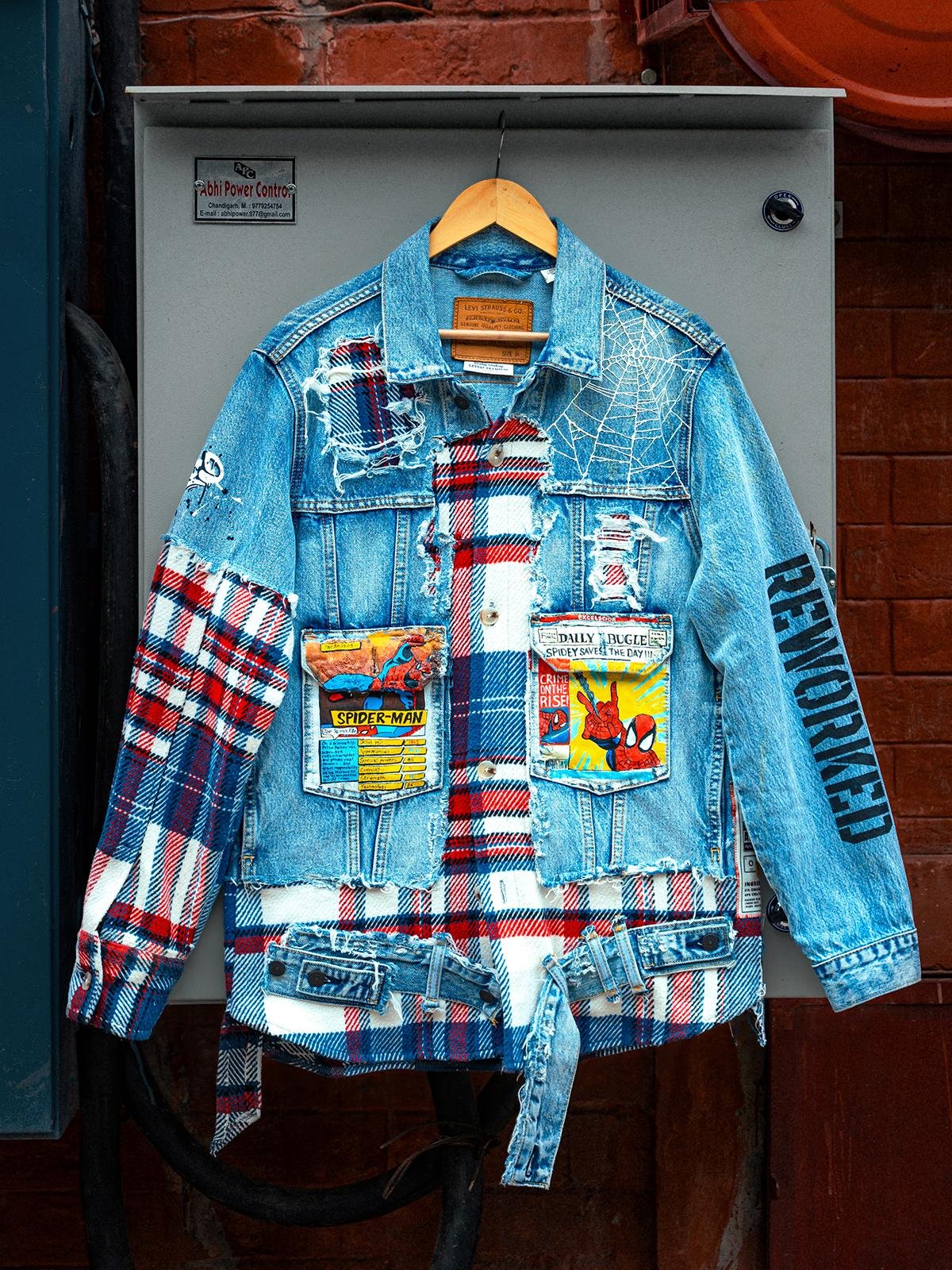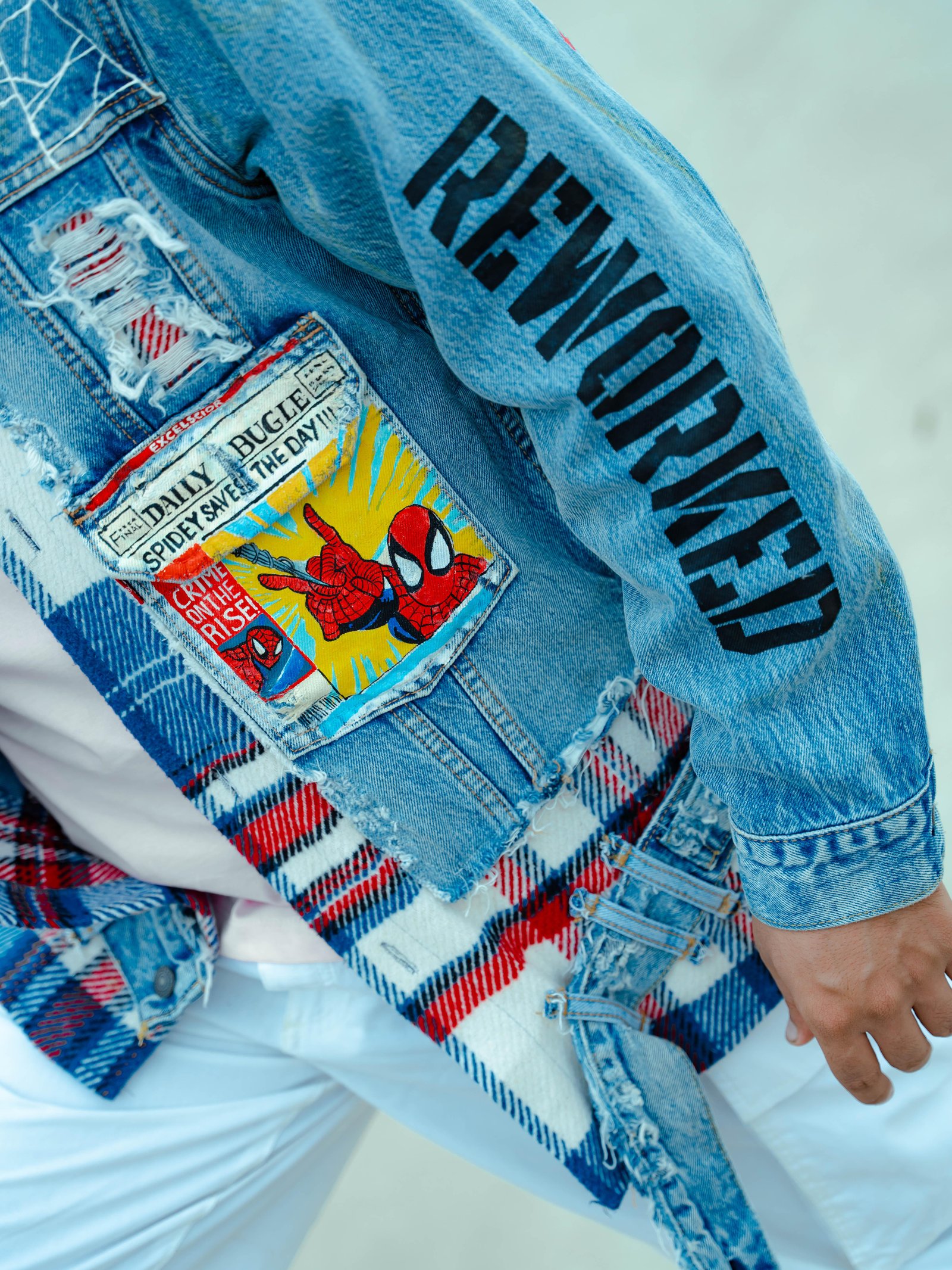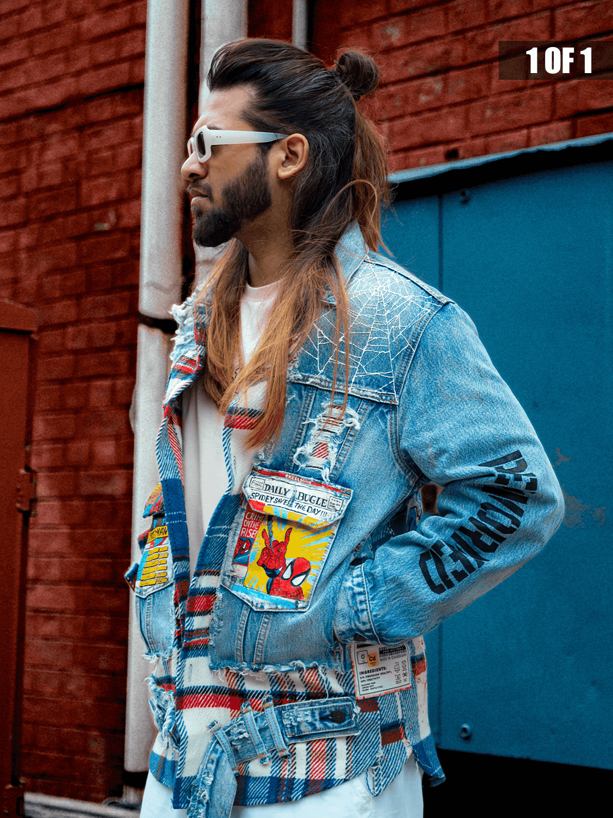 You can’t be a friendly neighborhood Spider-Man if there’s no neighborhood.” This reworked Spider-Man jacket is a bold evolution of the OCD classic, featuring a hand-painted Spidey in dynamic motion over a spray-splattered, web-threaded denim base. The back is framed with comic panel patches and a torn plaid underlay, stitched for contrast and chaos. The front brings in layered distressing, stenciled logos, and that unmistakable REWORKED signature. A wearable crossover of nostalgia, grit, and full-blown superhero fantasy.
