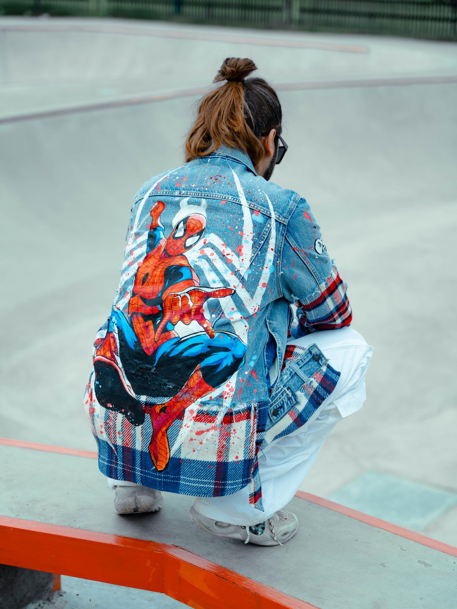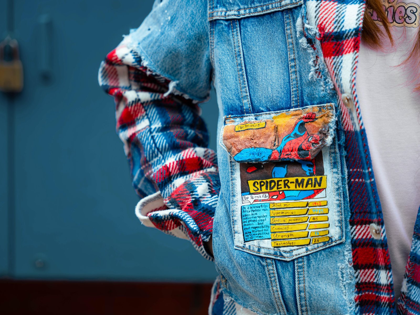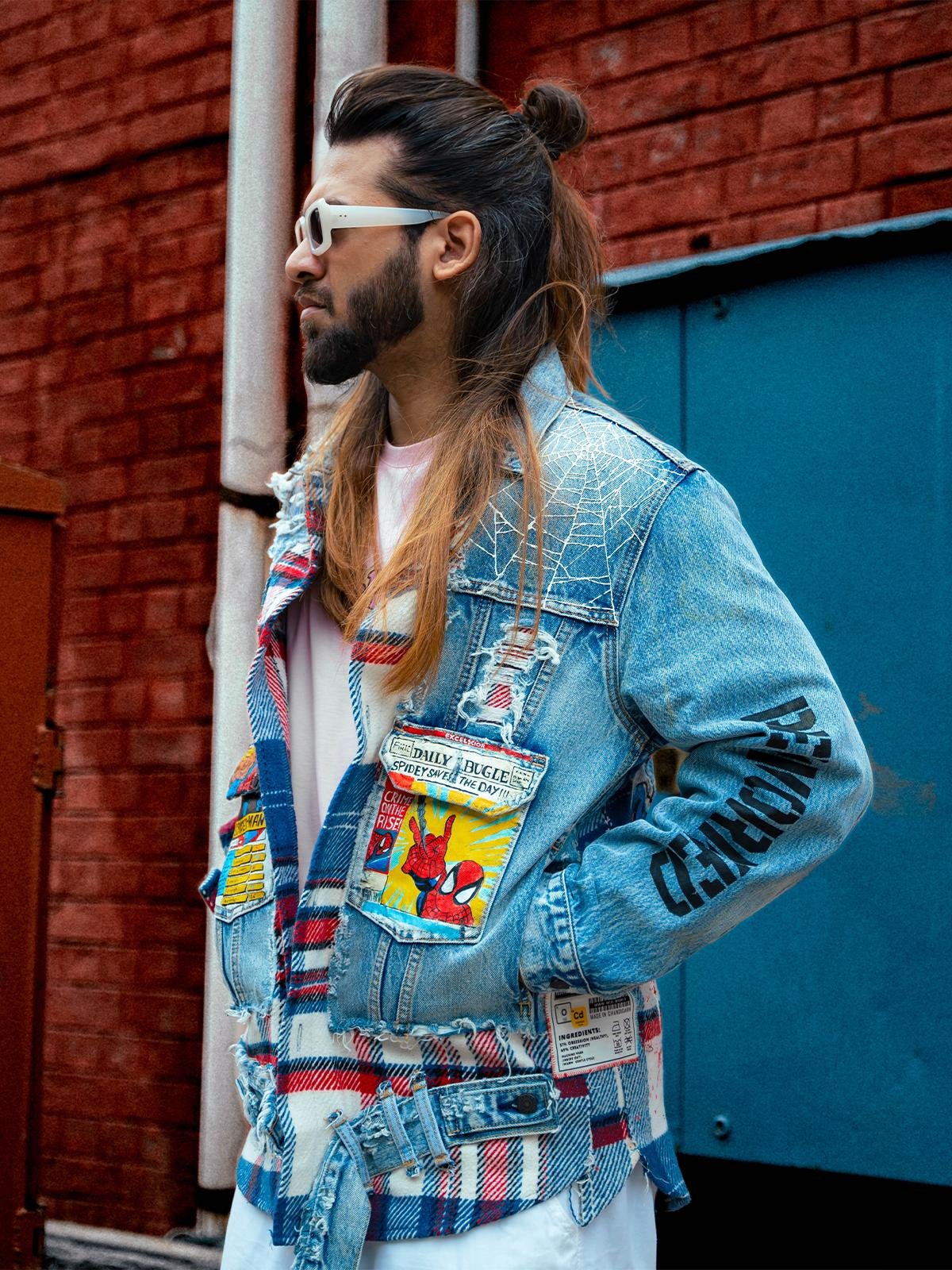 You can’t be a friendly neighborhood Spider-Man if there’s no neighborhood.” This reworked Spider-Man jacket is a bold evolution of the OCD classic, featuring a hand-painted Spidey in dynamic motion over a spray-splattered, web-threaded denim base. The back is framed with comic panel patches and a torn plaid underlay, stitched for contrast and chaos. The front brings in layered distressing, stenciled logos, and that unmistakable REWORKED signature. A wearable crossover of nostalgia, grit, and full-blown superhero fantasy.