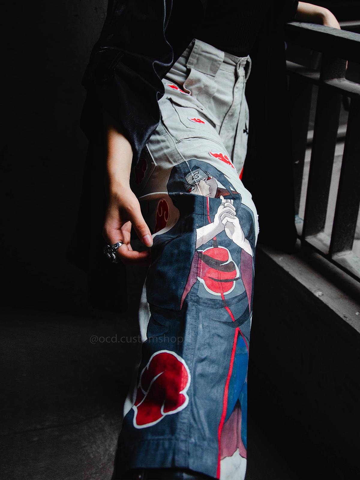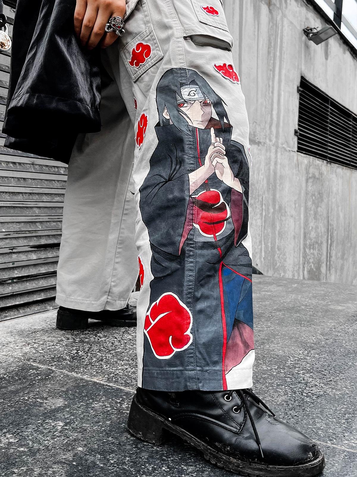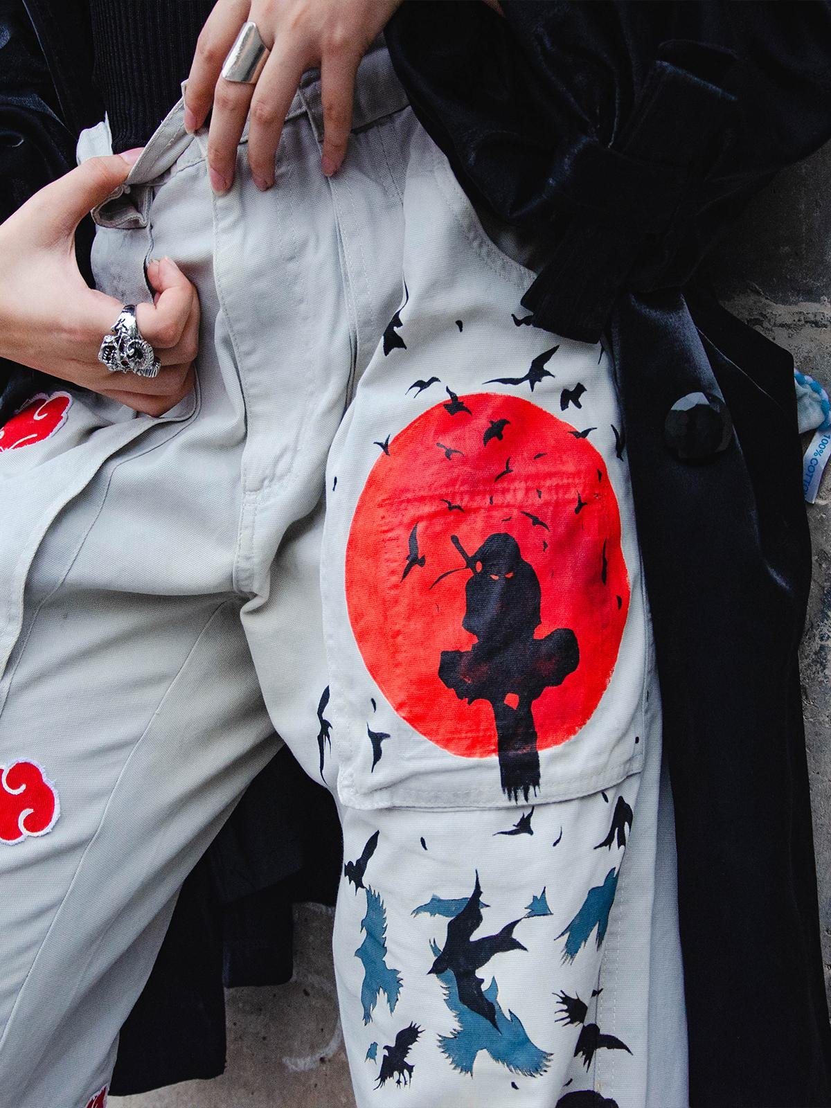 These Itachi Uchiha-inspired cargo pants capture the legendary warrior’s essence with hand-painted artwork of Itachi, the blood-red moon, and a mesmerizing flock of crows. The Akatsuki cloud patches add a striking contrast, while the bandana-inspired patchwork details give the design an extra streetwear edge.