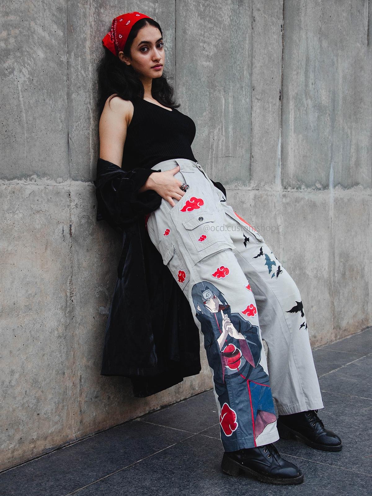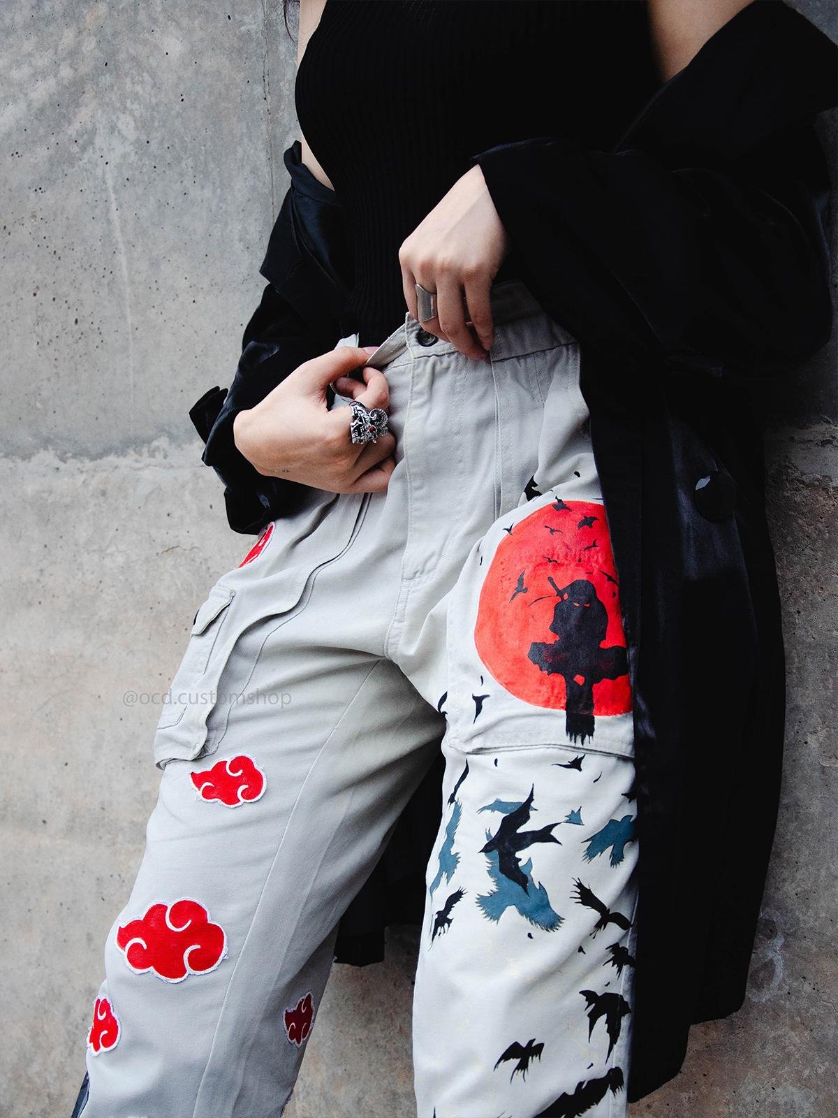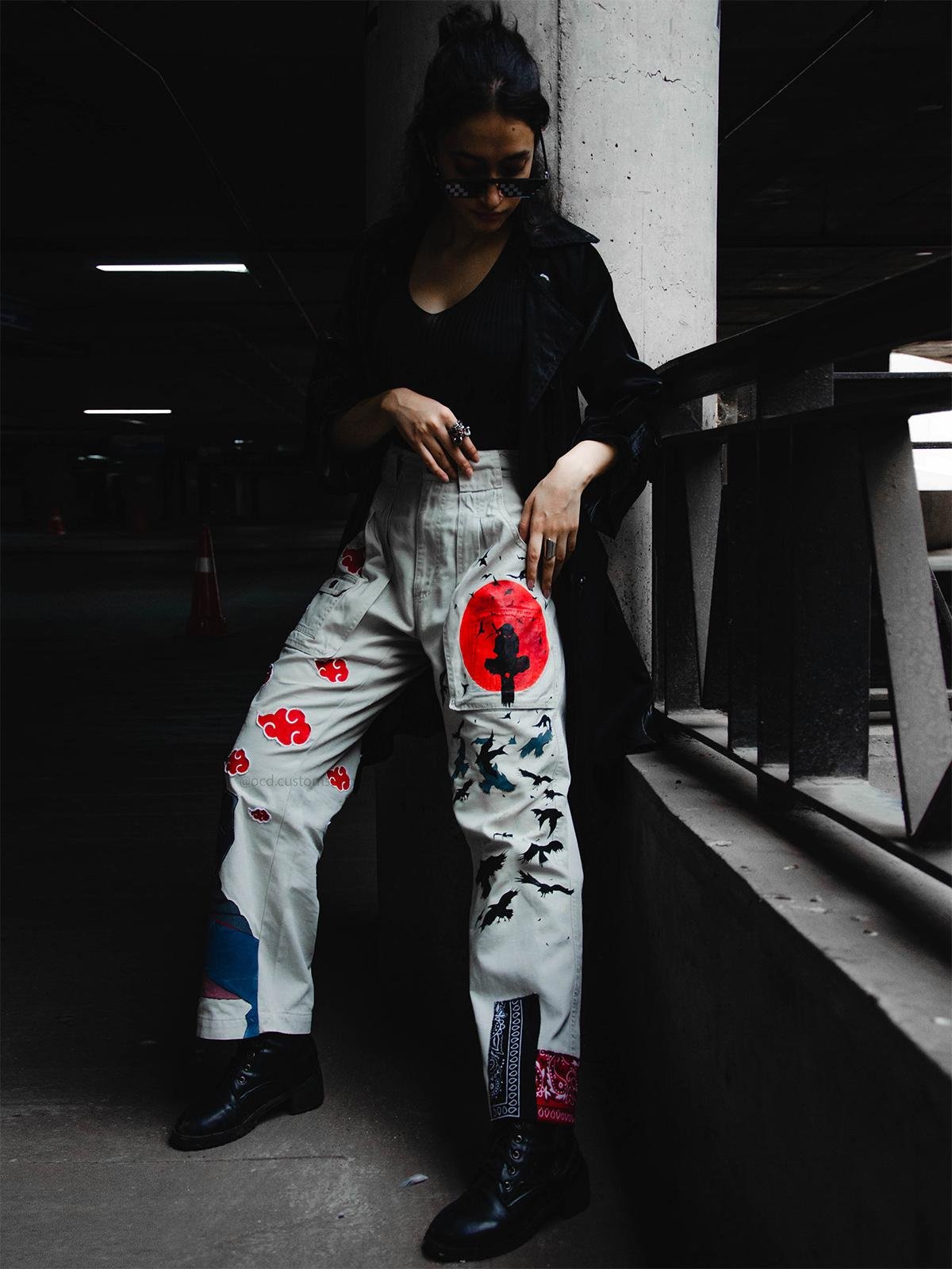 These Itachi Uchiha-inspired cargo pants capture the legendary warrior’s essence with hand-painted artwork of Itachi, the blood-red moon, and a mesmerizing flock of crows. The Akatsuki cloud patches add a striking contrast, while the bandana-inspired patchwork details give the design an extra streetwear edge.